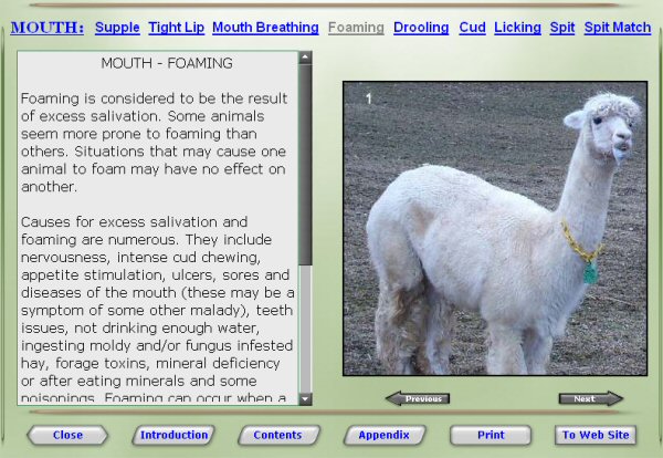 This is a picture of the Mouth chapter from ALPACA TALK. It is for demonstration only and has been compressed for displaying on this web page. ALPACA TALK will display on your monitor with a display resolution of 800 x 600. Purchase Alpaca Talk in the Gentle Spirit Store The clarity of the book on your monitor will be excellent! This is the "Foaming" Chapter in the "Mouth" Section of the book. The left side of the reading pane is scrollable text, just like on a web site. Click the arrows under the picture to see more pictures. Across the top of the page, the words in blue, are links to the other chapters in the the "Mouth" Section. The name of the chapter you are reading shows in gray. The buttons on the bottom of the reading pane take you to the "Introduction", "Table of Contents", and "Appendix". The "Print" button prints the chapter and pictures you are currently viewing. "To Web Site" connects to the Gentle Spirit Behavior & Training web site and "Close" closes the book. |
